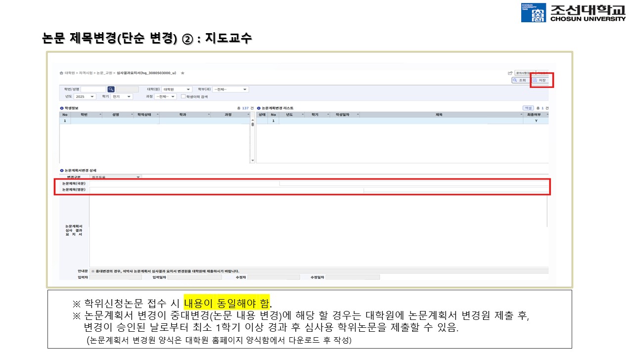 11. 최종 심사 완료 후 논문 제목이 변경된 경우에는 지도교수가 차세대종합정보시스템에서 대학원-> 논문_교원 -> 심사결과요지서