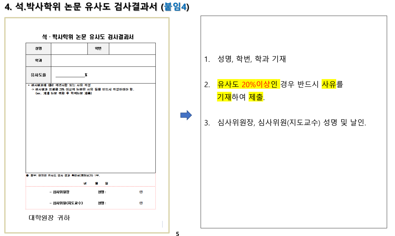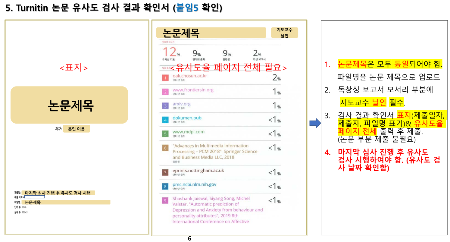 8. 학위논문 유사도 검사는 ‘턴잇인(Turnitin)’ 프로그램을 이용하며 검사설정 및 기준 등은 학과의 특성에 맞추어 검사를 실시하며, 유사도율 20% 이상의 논문은 반드시 사유를 작성하여 제출한다.