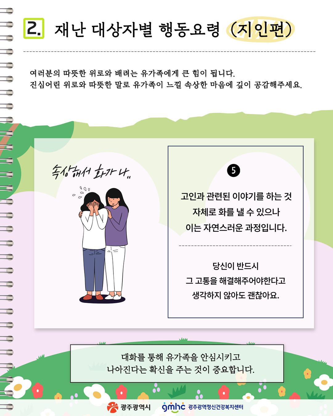 fnctId=bbs,fnctNo=634 글번호 219681 [광주광역정신건강복지센터] 재난대상자별 행동요령 유가족 유가족 지인편 작성일 2025.02.25 수정일 2025.02.25 작성자 원스톱학생상담센터관리자 조회수 4455 첨부파일 정신건강·정신질환 인식개선 및 정보제공 콘텐츠.pdf